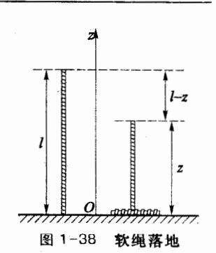 长为l质量为m的软绳,开始时竖直悬挂着,下端刚好触地;现使软绳从静止状态自由下落。求软绳下落到空中所剩长度为z时地面对绳子的作用力,如图 1-38 所示。