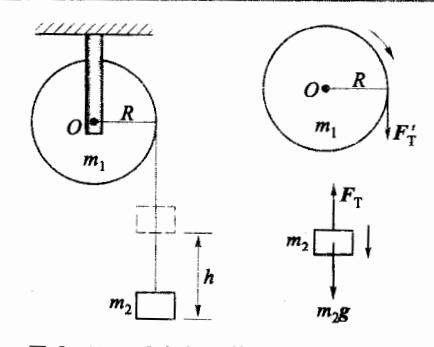如图 2-15 所示,细绳的上端缠绕在质量为 m1m_1 、半径为 R 的定滑轮上,细绳的下端与质量为 m2m_2 的物体相连,系统初态静止。此后物体下落并带动定滑轮转动,求物体下落 h 高度时的速率 v。不计一切阻力,细绳不可伸长且质量可以忽略,定滑轮相对转轴 O 的转动惯量为 I=m1R2/2I=m_1R^2/2