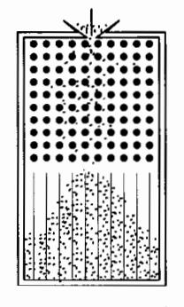 伽尔顿板实验能清楚说明这种统计规律性的存在。如图 3-5 所示,在一块竖直木板上部规则地钉有许多铁钉,木板下部设有许多等宽的竖直狭槽,板的前面覆盖上玻璃,板的顶端中部有漏斗形小口,这一装置称为伽尔顿板。实验时,将一个小球从小口投入伽尔顿板,小球在下落过程中先后与多根铁钉发生碰撞,最后落入下部的某个狭槽中。重复几次这一实验,发现小球落入哪个狭槽是不确定的,也是无法预测的。但是,如果同时在伽尔顿板中投入大量相同的小球(或将一个小球投入伽尔顿板的次数增至很大),则狭槽中小球的数目(或小球出现的次数)呈现出了一定的规律性,即中间狭槽多,两侧少。重复多次实验,小球数目(或出现次数)的这种分布几乎不变,而且,小球总数(或小球投入总次数)越大,这种分布差别越小。这说明,小球落入狭槽中的概率分布遵从一定的统计规律。