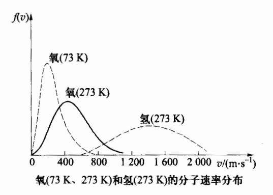 由此可见, f(vp)f(v_p)vpv_p 均与分子质量 m 和温度 T 有关。图 3-8 给出了同种气体在不同温度及给定温度下不同气体分子的速率分布曲线。对于一定种类的气体(例如 O2O_2 ),温度越高,分子热运动越剧烈,所以随温度升高,气体中速率较小的分子数减少,速率较