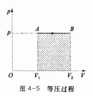 常量)。理想气体的准静态等压过程在 p-V 图上是一条平行于横轴的有向线段,如图 4-5 所示为从状态 A(p,V1,T1)A(p,V_1,T_1) 到状态 B(p,V2,T2)B(p,V_2,T_2) 的等压过程。