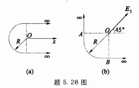 5.28 一根无限长均匀带电线,被弯曲成如图 所示的两种形状。如果该线的电荷线密度为 A,弧 形曲率半径为 R,分别求出两种情况下 O 点处的 场强。