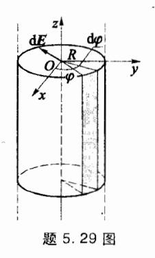 1. 29 如图所示,一根无限长带电圆柱面处于柱 坐标系中,z 轴沿圆柱面轴向,电荷面密度 σ=σ0cosφ\sigma = \sigma_0 \cos \varphi ( σ0\sigma_0 为常量),求圆柱面轴线上的电场强度。