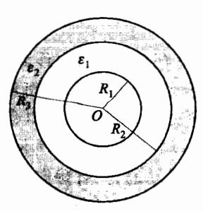 图 5-51 为两个同心导体球壳,其内球壳的半径为 R1R_1 ,外球壳内表面半径为 R2R_2 ,两球壳间充满相对介电常量为 ϵ\epsilon . 的电介质。