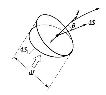 dI=JcosθdS=JdSidJ=dIdSen(6.1.4)dI = J\cos\theta dS = J \cdot dS \quad \text{id} \quad J = \frac{dI}{dS_{\perp}} e_n \qquad (6.1.4)