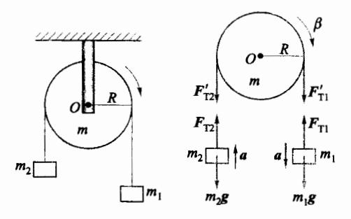 如图 2-10 所示,一轻绳跨过一质量为 m、半径为 R 的定滑轮,绳的两端各悬挂一物体,质量分别为 m1m_1m2m_2 ,且 m1m_1 > m2m_2 。忽略定滑轮轴上的摩擦,绳子不可伸长且与定滑轮之间无相对滑动,定滑轮视为均质圆盘,相对中心转轴 O 的转动惯量为 I=mR2/2I=mR^2/2 。求:物体的加速度和两侧绳中的张力。