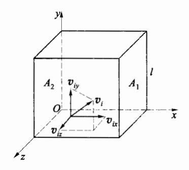 考虑一棱长为l的立方体容器(图 3-3),里面贮有N个质量为m的同种理想气体分子。考虑到在平衡状态时,容器器壁各处压强相同,所以任选器壁的一个面,例如选择与x轴垂直的 A1A_1 面,计算其所受的压强。