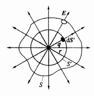 对静电场中高斯定理的讨论,本书采用由特殊到一般的方法进行。如图 5-14 所示,假设一正电荷 q 被包围在一个闭合 S 中。为了确定通过该闭合曲面的电场强度通量,以 q 为中心作一半径为 r 的球面 S',点电荷在球面 S'上各点的场强 E 由式(5.1.5)确定,由于球面上各点到 q 的距离处处相等,且 S'面上任意点的面矢量,都与该点场强 E 方向一致,通过球面 S'的电场强度通量为