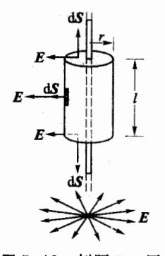 解:由对称性可知,"无限长"带电直线的电场,在位于与直线垂直的平面内,电场线呈辐射状,即电场线只能沿径矢方向。在平面上距带电直线相等各点处 E 的数值相等,即电场线具有轴对称性。现以该带电直线为轴,作一半径为 r、长度为 l 的圆柱形高斯面,如图 5-18 所示,高斯面两个底垂直于带电直线,则其电场强度通量为