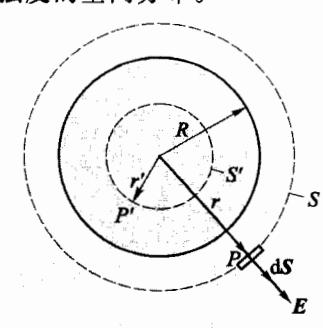 当场点位于球内任一点 P'时,以球心为中心,过 P'点作一同心球面 S'为高斯面,通过 S'面的电场强度通量为