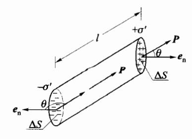 如图 5-42 所示,在均匀电介质中取一长为 l、底面积为 ΔS\Delta S 、体积为 ΔV\Delta V 的斜柱体,电极化强度 P 平行于斜柱体轴线,斜柱体底面外法线用单位法线矢量 e。表示,斜柱体两个底面上出现束缚电荷,其电荷面密度分别为 ±σ\pm \sigma' 。若将斜柱体看作一个由正、负电荷构成的电偶极子,其电偶极矩为