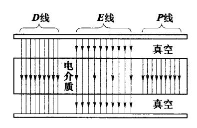 形象描述 D 的空间分布曲线称为电位移线(即 D 线), D 线仅与自由电荷有关。式(5.6.7)的物理意义为:穿过闭合曲面的电位移通量,等于闭合面内所包围的所有自由电荷的代数和。图 5-46 给出描述 DEPD \setminus E \setminus P 的三种空间分布曲线的关系。