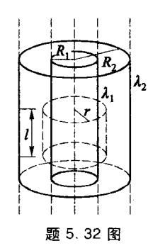 1. 32 如图所示,半径分别为 R1R_1R2R_2 的同轴无限长圆筒,筒面均匀带电,沿轴线单位长度电荷线密度分别为 λ1\lambda_1λ2\lambda_2 。求: