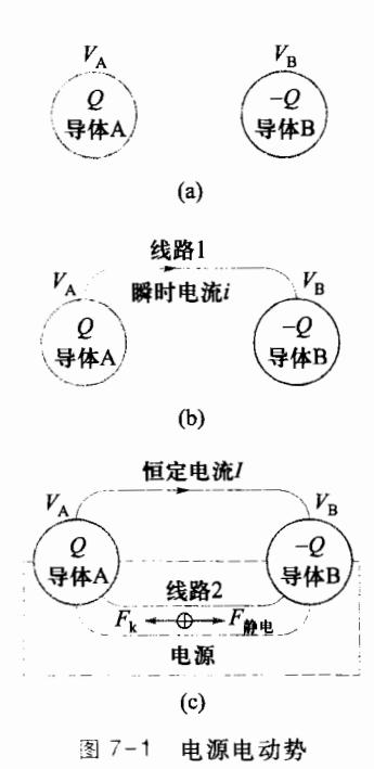 欲使某条导线 l 有电流通过,导线内部就应该存在一个电 场。欧姆定律的微分形式告诉人们,导线中各点处的电流密度是 与导线中各点处的电场强度成正比的,即 。若要在导线中 建立电场,导线两端须存在电势差。设想有两个导体 A 和 B,如 图 7-1(a) 所示, 其中导体 A 带有正电荷, 导体 B 带有等量的负 电荷,导体 A 的电势 高于导体 B 的电势 , 。当用 导线 l 将导体 A 和 B 连接后,在导线 l 内就建立起了电场,电场 的方向循导线由导体 A 指向 B,如图 7-1(b)所示。在静电场的 作用下,依然假设电流是正电荷定向移动产生的,则导体 A 所带 的正电荷循着导线迁移到导体 B,这个过程使导线中有电流通 过。但是,这个电流随着导体 A 所带正电荷不断减少,导体 B 所 带正电荷不断增加,导体 A、B 间的电势差愈来愈小,直至为零 。这个过程非常短暂。导线 l 和导体 一起成为 等势体,导线内的电场和电流也随之消失。而要想在导线 l 中维 持一个恒定的电流,就需要在导线内维持一个恒定的电场,而要 达到这一点,导体 A、B 中电荷分布的差异就应该保持恒定, A、B 间的电势差就应维持恒定。为做到这些,可以考虑在导线通有电 流时,设法给失去正电荷的导体 A 及时补充正电荷,设法使迁移 到导体 B 上的正电荷及时排除掉,使连接导线两端 A 、B 两个导 体的电荷分布维持一个动态平衡。