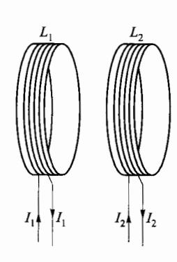 如图 7-14 所示,两个相对放置的线圈 L1L_1L2L_2 ,设线圈 L1L_1L2L_2 通过的电流分别为 I1I_1I2I_2 。设 I1I_1 产生的磁场通过线圈 L2L_2 的磁链为 Ψ21\Psi_{21} ,由毕-萨定律,线圈 L1L_1 中的电流 I1I_1 在空间产生的 B1B_1I1I_1 成正比,因此 Ψ21\Psi_{21} 也与 I1I_1 成正比,同理 Ψ12\Psi_{12} 应与 I2I_2 成正比,即