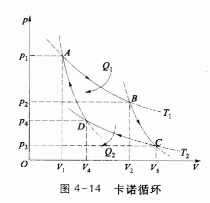 18世纪末到 19世纪初,蒸汽机在工业上的应用越来越广泛,但当时蒸汽机的效率很低,只有 3%5%,有超过 95%的能量未被利用。因此,如何提高热机效率,成为当时许多科学家和工程师孜孜以求的问题。1824年,法国青年工程师卡诺(Sadi Carnot)提出了一种理想热机,称为卡诺热机,其中工作物质的循环过程,称为卡诺循环,它由两个等温过程和两个绝热过程构成,所有过程都是准静态的,如图 414 所示。在整个循环过程中,卡诺热机的工质只与两个恒温热源交换热量,在温度为 T,的高温