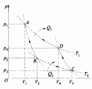 下面,分析以理想气体作为工作物质的卡诺循环的效率。在循环过程中,工质从高温热源 T1吸收的热量为