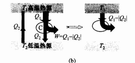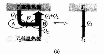 他影响。现将这部分功用来驱动制冷机 B,使制冷机从低温热源 T2T_2 吸收热量 Q2Q_2 ,并向高温热源 T1T_1 放出热量 W+Q2=Q1+Q2W+Q_2=Q_1+Q_2 。若使 两部机器联合工作,结果实现了热量 Q2Q_2 从低温热源 T2T_2 传向高温 热源 T1T_1 ,而没有引起其他变化。这正好与克劳修斯表述相矛盾。