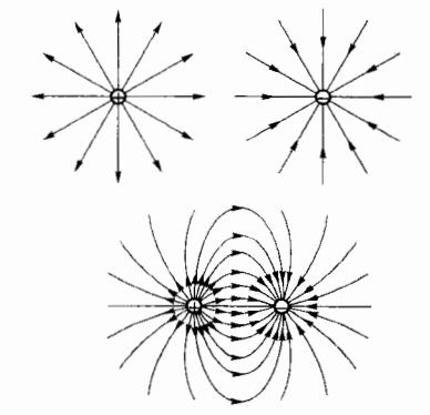 为了形象地描述电场强度在空间的分布,引入一组带有方向的曲线(图 5-12),正的检测电荷在曲线上任意一点受力的切线方向,表示该点的场强方向;空间某区域内曲线的疏密反映出该区域电场强度的大小,这样的曲线称为电场线(曾用名:电力线)。描述静电场的电场线总是由正电荷出发,终止于负电荷或无穷远处。在没有电荷的空间,电场线既不会产生,也不会中断。由于空间任意点处的电场强度只有一个方向,所以电场线也不会相交。
