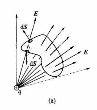 如图 5-15(a),若点电荷 q 处于高斯面之外,由于电场线的连续性,q 所产生的电场线穿入高斯面的部分,能够完全从高斯面穿出,故位于高斯面之外的电荷在该面产生的电场强度通量为零,即