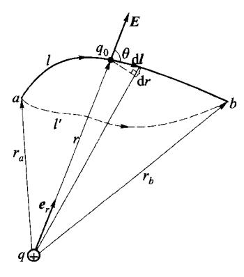 如图 5-20 所示,在一个点电荷 q 产生的电场中,将一正的检 验电荷 q0 从 a 点沿任意路径 l 移动到 b 点,电场力对 q0 做功为