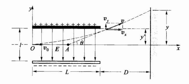 当水平偏转板间没有电场时,电子以速率 进入到竖直偏转区域,如图 5-30 所示。如果此时竖直偏转板间有电势差 ,并且上板电势高于下板电势,两板之间将建立一个场强 (l)为两板间距离)的电场,电子在通过竖直偏转区域时就会受到一个向上的力 F,所产生的加速度 ,其水平速度不变。电子在该偏转区经历的时间 ,式中 L 为偏转区的长度,在这段时间内电子获得向上的速度 ,电子向上的位移 。若该竖直偏转板与荧光屏的距离为 D,则电子击中荧光屏后,发亮点与中心距离 ,式中 是加速电压, 为竖直偏转板间的电压。当 不变时, 和 成正比,因此可以通过改变偏转板上的电压大小,来改变荧光屏上发亮点的位置。老式电视机的显像管,除了将偏转电子束的方法改用了磁场外,其原理与这里所讨论的问题类似。