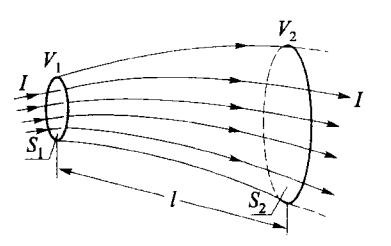 导体电阻与材料性质、导体形状及温度有关。实验表明,在温度不变的情况下,对一段均匀圆柱体而言,电阻的大小与其长度 l 成正比,与其截面积 S 成反比,即