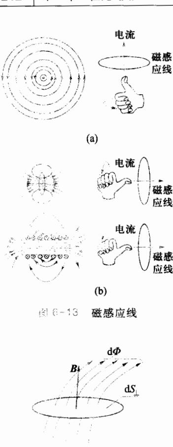 分析图 6-14 中各种情况下 B 线的形状,可以看出以下特征:① 描述磁感应线的 B 线,都是闭合线,既无起点也无终点;② B 线总是与闭合电流线相互套连,利用右手可以判断两者间方向关系。若使握拳的右手四指代表电流方向,则伸出的拇指就代表 B 线的方向;若右手四指表示 B 的方向,则拇指就代表电流方向。由于 B 线都是闭合曲线,则穿过空间任意闭合曲面的磁通量为零,即