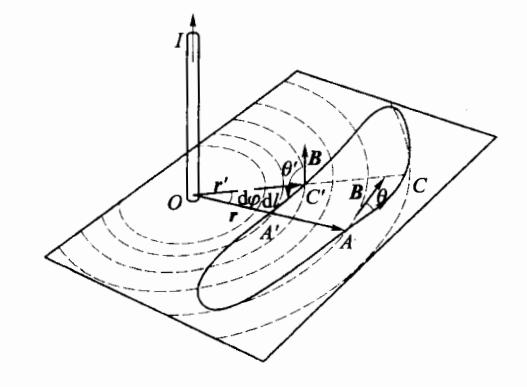 图 6-16 为一通有电流 I 的无限长直导线,电流方向如图所示,在它的周围有闭合路径 l,方向如图所示。由载流导线所在的 O 点引两条射线 OA、OC 与 l 相交于 A、C 和 A'、C',于是在 l 上得到一对位移元 dl 和 dl',它们对 l 有相同的张角 dφd\varphi ,设 OA 长为 r,OC'长为 r',位移元 dl 所对应的磁感应强度为 B, B 与 dl 的夹角为 θ\theta , θ\theta 为锐角; dl'所对应的磁感应强度为 B',B'与 dl'的夹角为 θ\theta' , θ\theta' 为钝角,则有
