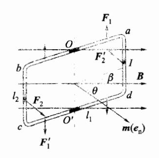 现将一个长、短边分别为 l1l_1l2l_2 的刚性矩形平面线圈沿 abcda 方向通上电流为 I 电流后,放入磁感应强度为 B 的均匀磁场中,其单位法线矢量 ene_n 与 B 的夹角为 θ\theta ,如图 6-21 所示。根据安培定律,可以计算出线圈每个边框所受的磁力。