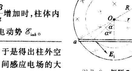 在一半径为R的圆柱形空间内,充满一均匀磁场,磁感应强度B沿柱的轴线,在柱形空间的某一截面上,如图 7-8 所示,放置一长为L的金属棒 ab,求:(1)当B以速率 d B d t \frac{dB}{dt} d t d B 增加时,柱体内外感应电场E,的大小;(2)求杆 ab 两端的感应电动势 E \mathcal{E} E ,
