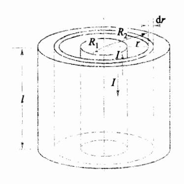 - *7.17 求同轴电缴单位长度上的自感系数。设同 轴电缆芯的半径为 R., 外层导体筒的半径为 R., 两者 间介质的相对磁导率为 ,芯的磁导率为 。