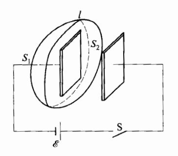以电容器的充放电为例,如图 8-2 所示,在电容器充放电的过程中,仍然应用安培环路定理(8.1.1),并将积分环路 l 取在靠近电容器的一个极板处,以 l 为边界分别围出 S1 和 S2 两个曲面,曲面 S1 与导线相交,曲面 S2 位于两极板之间,对于曲面 S1 ,式 (8.1.1)依然成立,即