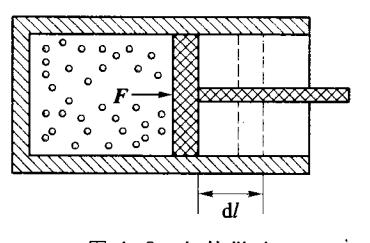 如图 4-2 所示,一定量的气体被封闭在气缸内,活塞可以在气缸内无摩擦地左右移动。假设在活塞移动过程中,气体所经历的过程为准静态过程。因活塞和气缸间无摩擦,所以气体所进行的是无摩擦的准静态过程,任意时刻活塞和气体间所互施的作用力都相等。设气体压强为p,体积为V,活塞面积为S。当活塞缓慢地移动一微小距离 dl 时,气体对外界所做的元功为 dW = Fdl = pSdl,即