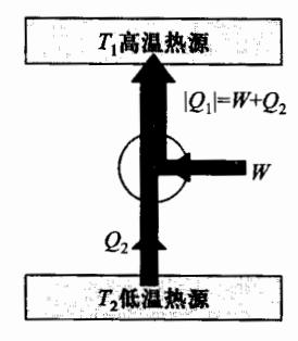 他影响。现将这部分功用来驱动制冷机 B,使制冷机从低温热源 T2T_2 吸收热量 Q2Q_2 ,并向高温热源 T1T_1 放出热量 W+Q2=Q1+Q2W+Q_2=Q_1+Q_2 。若使 两部机器联合工作,结果实现了热量 Q2Q_2 从低温热源 T2T_2 传向高温 热源 T1T_1 ,而没有引起其他变化。这正好与克劳修斯表述相矛盾。