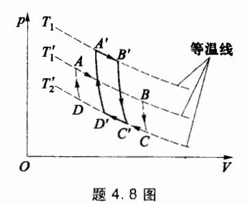 4.8 如图所示,一定量的某理想气体所做的两个卡诺循环在不同的高温线上,但循环曲线 ABCDA 和 A'B'C'D'A'所围面积相同,则两循环中,系统对外所做 净功是否相同?效率是否相同?吸收热量和放出热量是否相同?