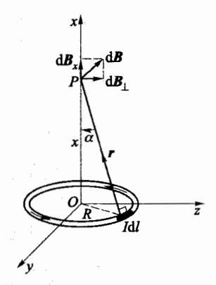 产生磁感应强度 B 的值,可以对 dB 进行积分,但是过程比较复杂。简单的方法是将 dB 分解为沿 x 轴方向的分量 dBxdB_x 和垂直 x 轴的分量 dBxdB_x ,由于圆线圈具有轴对称性,使全部的 dBxdB_x 叠加后结果为零。因此,