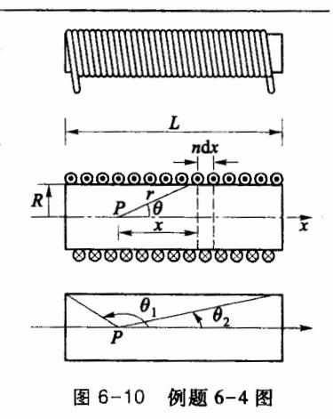 选螺线管的轴线向右为 x 轴的正方向, 选场点 P 与坐标原点重合,在距 P 点为 x 处 选长度为 dx 的一小段螺线管。 dx 所对应 的载流线圈的匝数为 ndx,每一匝通有电流 I 的线圈在 P 点处产生的磁感应强度,可以 通过式(6.2.4)计算,而 ndx 匝线圈在 P 处 的磁感应强度可由下式计算: