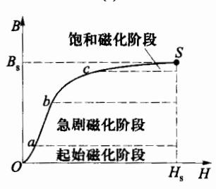 观察 H-B 曲线,由 O 到 S 这段曲线称为起始磁化阶段,而其中 Oa 阶段称为初始磁化阶段,ab 阶段称为急剧磁化阶段,到了 bc 阶段磁化开始变得缓慢,而在 cS 阶段磁感应强度 B 几乎不再随着 H 的增大而增大,则该阶段称为饱和磁化阶段。当磁化进入饱和状态后,逐步减小 H,B 随之相应地减小。但是,其过程并不沿起始磁化曲线返回,而是沿另外一条曲线 Sk 进行,如图 6-31(a) 所示。当H=0 时, ,称 为剩余磁感应强度。此时若撤去外磁场 H,铁磁质物质将成为一个永磁体。要去掉铁磁材料中的 ,也就是使铁磁材料退磁,须 H 反向。