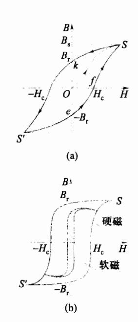 不同的铁磁质材料,对应不同形状的磁滞回线。有的磁滞回线宽些,有的窄些。"宽"形曲线矫顽力 较大,剩磁 较强,通常将 值在 A·m-1范围的铁磁质叫作硬磁材料;而"窄形"曲线 较小,剩磁 小,通常将 的值在 A·m-1附近的铁磁质叫作软磁材料,如图 6-31(b)所示。另外,磁滞回线所围"面积"的大小反映了铁磁质在磁化、退磁过程中消耗能量的大小。一般说来,"面积"越大,消耗能量就越大。所以,在一般情况下,硬磁材料较软磁材料在磁化过程中要消耗更多的能量。