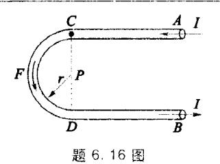 6.16 如图所示,一长导线在中部弯成图示形状,两端各延伸于很远处,圆弧半径为 r,通以电流 I 后,试求 P 点处的磁感应强度。