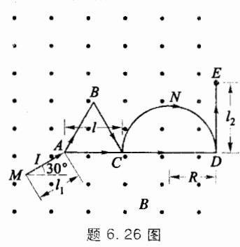 6.26 如图所示,在均匀磁场 B 中,在垂直于 B 的平面上放置电阻率较大的导线构件,从端点输入总电流 I,求 MA、等边三角形 ABC、半圆形 CND、及直线 CD、DE 各部分所受安培力。